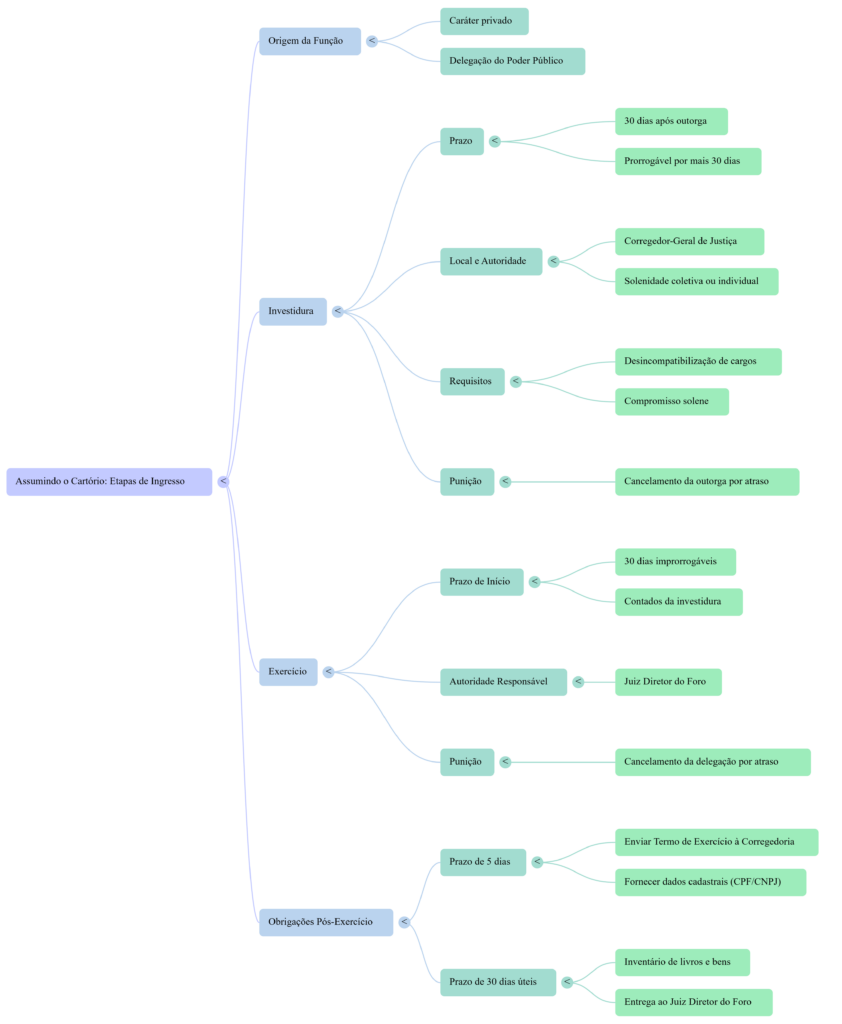 - Prazo e Local: A investidura deve ocorrer perante o Corregedor-Geral de Justiça (ou um Juiz por ele indicado) em até 30 dias após a publicação do ato de outorga. Esse prazo pode ser prorrogado uma única vez por mais 30 dias.