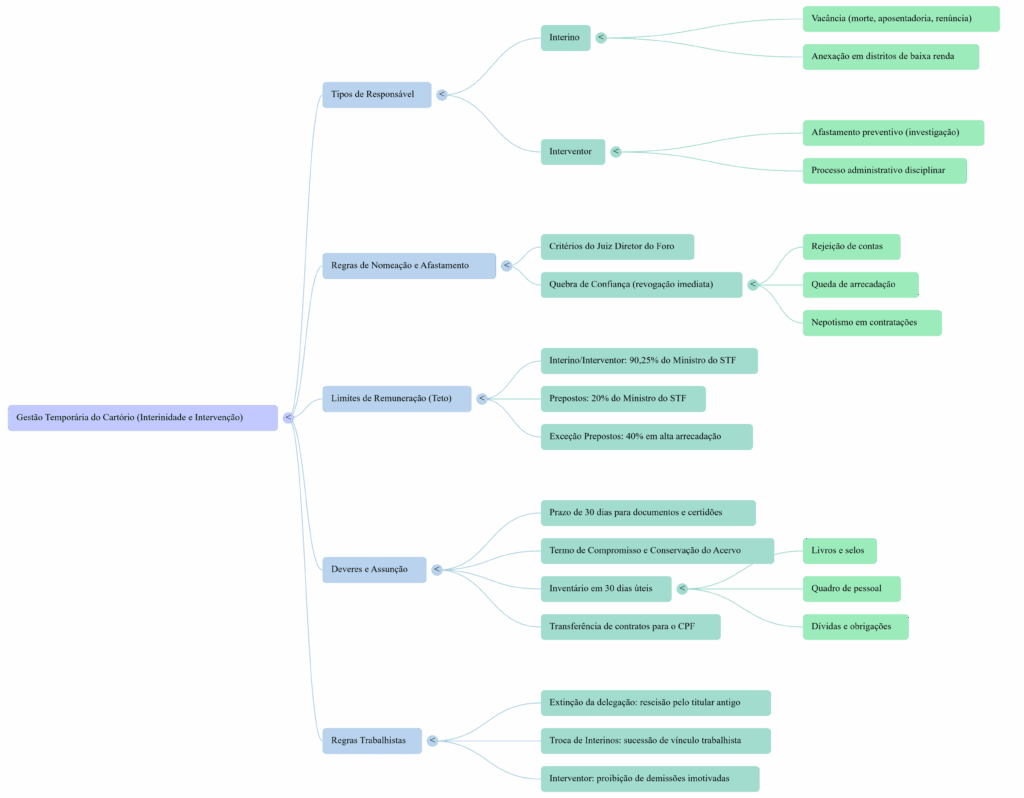 Abaixo está o resumo em tópicos rápidos sobre as regras de gestão temporária (interinidade e intervenção) em cartórios:
